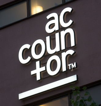 Accountor Ekonomi & Rådgivning valde den lättaste skylten som finns på marknaden. Materialval, tillverkningsteknik och infästningskonstruktion gör att skylten väger betydligt lättare jämfört med motsvarande traditionell skylt.