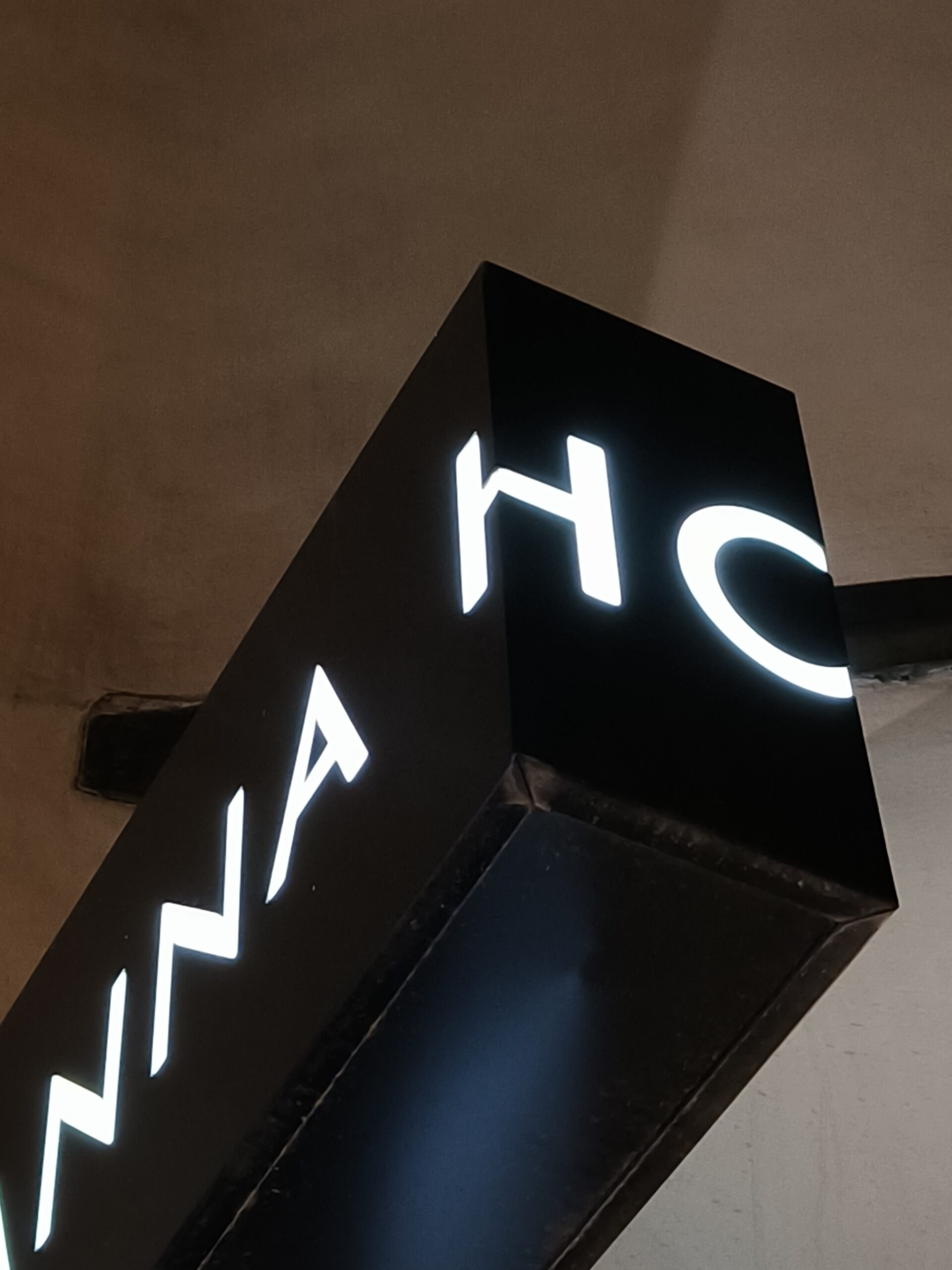 Den runddragna ljuseffekten längs skyltens kortsida ger ett oväntat djup och gör att skylten fångar rörelsen i gaturummet på ett subtilt sätt. Det är en lösning som fortfarande känns aktuell – både i form och uttryck – och ett exempel på hur små designval kan ge stor visuell effekt.