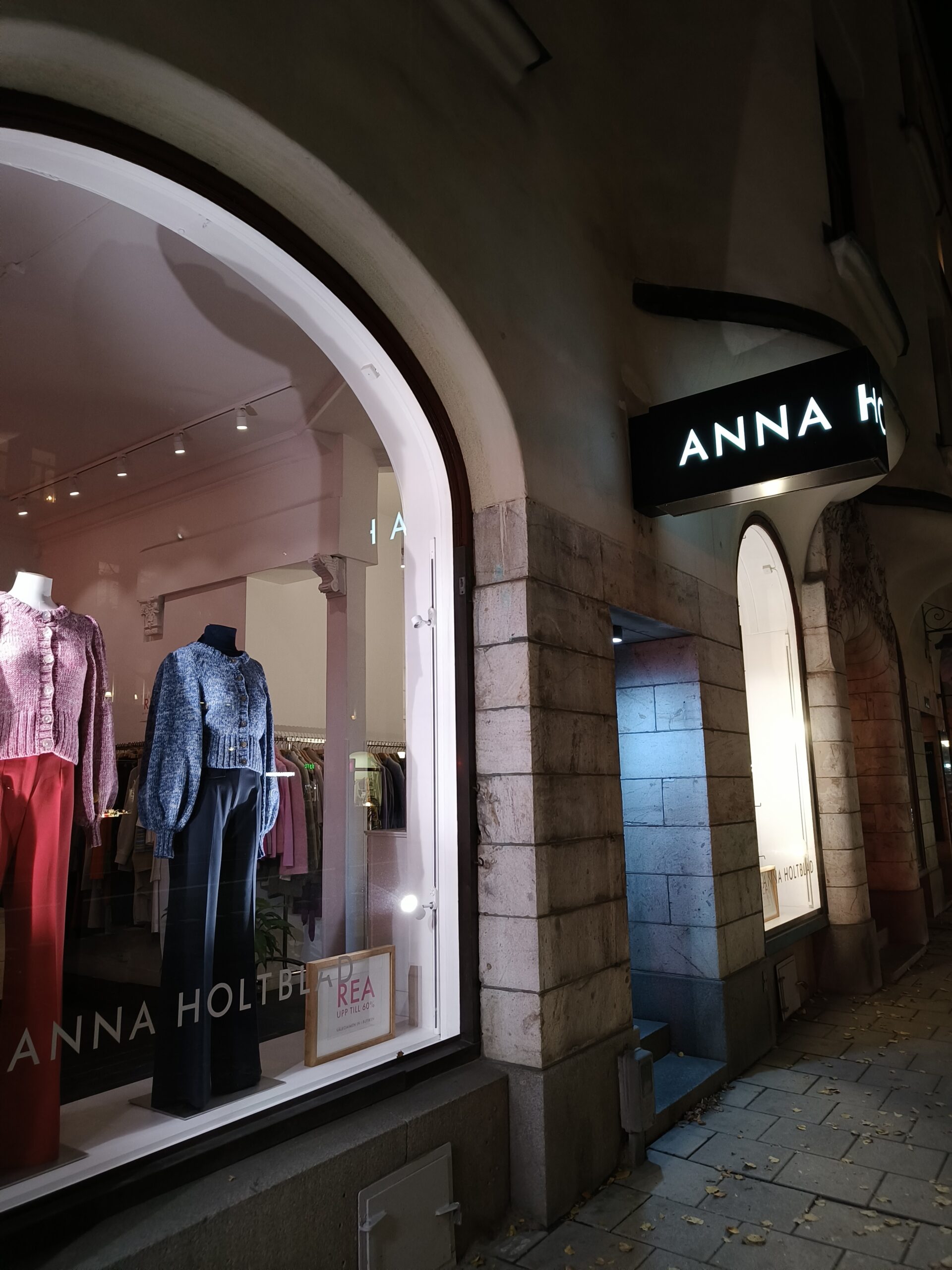 Till den etablerade modebutiken Anna Holtblad har vi levererat en dubbelsidig flaggskylt med en lösning som bryter mönstret utan att kompromissa med elegansen.