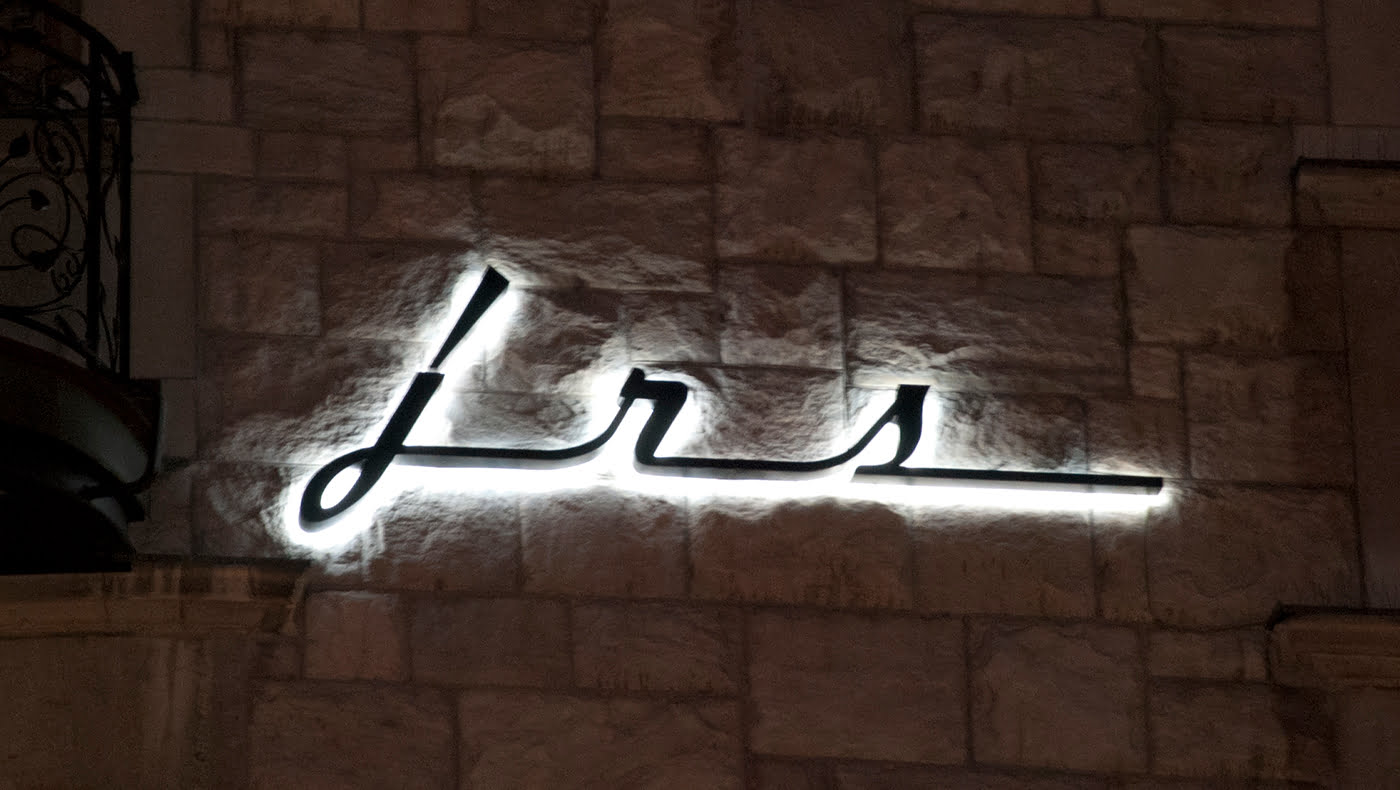 En stilren svart skylt med ett snirkligt typsnitt mot den ljusa vackra fasaden dagtid. Bakåtbelyst som ger en mäktig silhuetteffekt mot fasaden kvällstid.