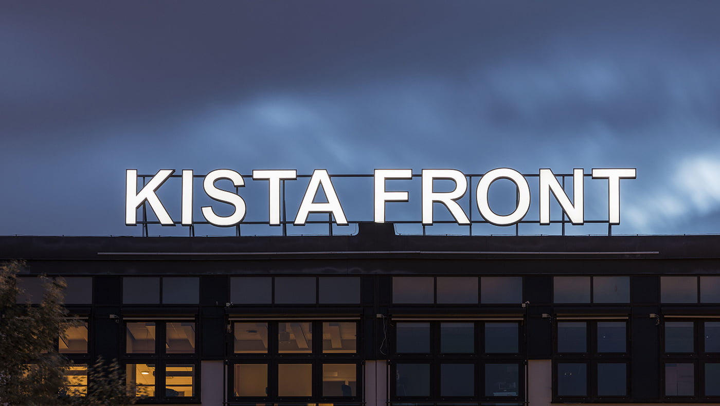 I Atrium Ljungbergs fastighetsregi har vi levererat såväl pyloner, hyresgästers fasadskyltar som folieringar i Ärvinge. Men det var först 2017 som byggnaden kom att döpas till KISTA FRONT och det med en storslagen takskylt.