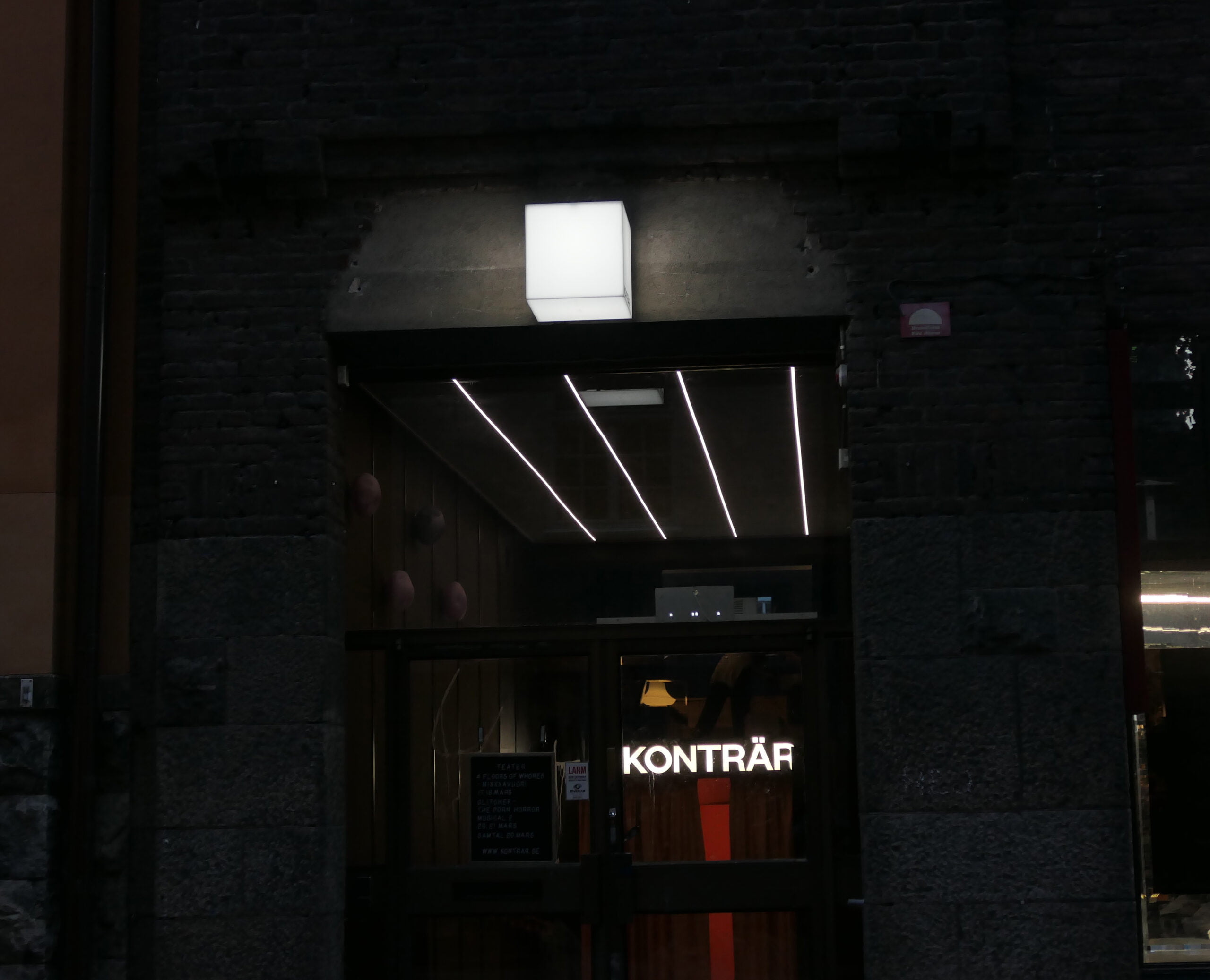 På ett nyskapande sätt har Konträr valt att sätta upp entréskylten på insidan av lokalen och markerar utvändigt bara med en diskret kub som talar ett tydligt färgspråk.