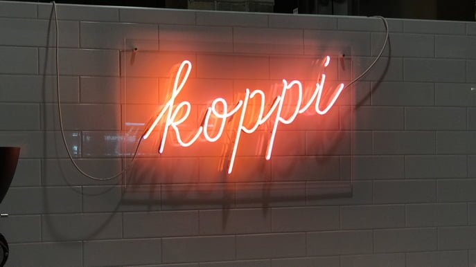 Neon monterat på plexi i sin naknaste form. Skylten togs fram när Koppi öppnade fik i Malmö Saluhall. När fiket stängdes fick skylten flytta in i rosteriet.