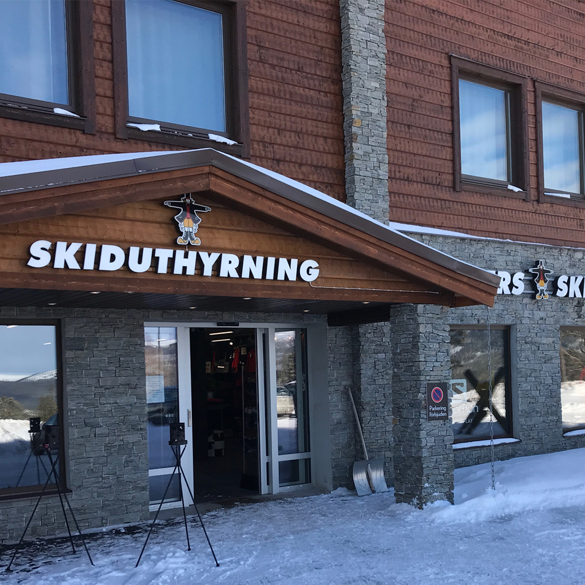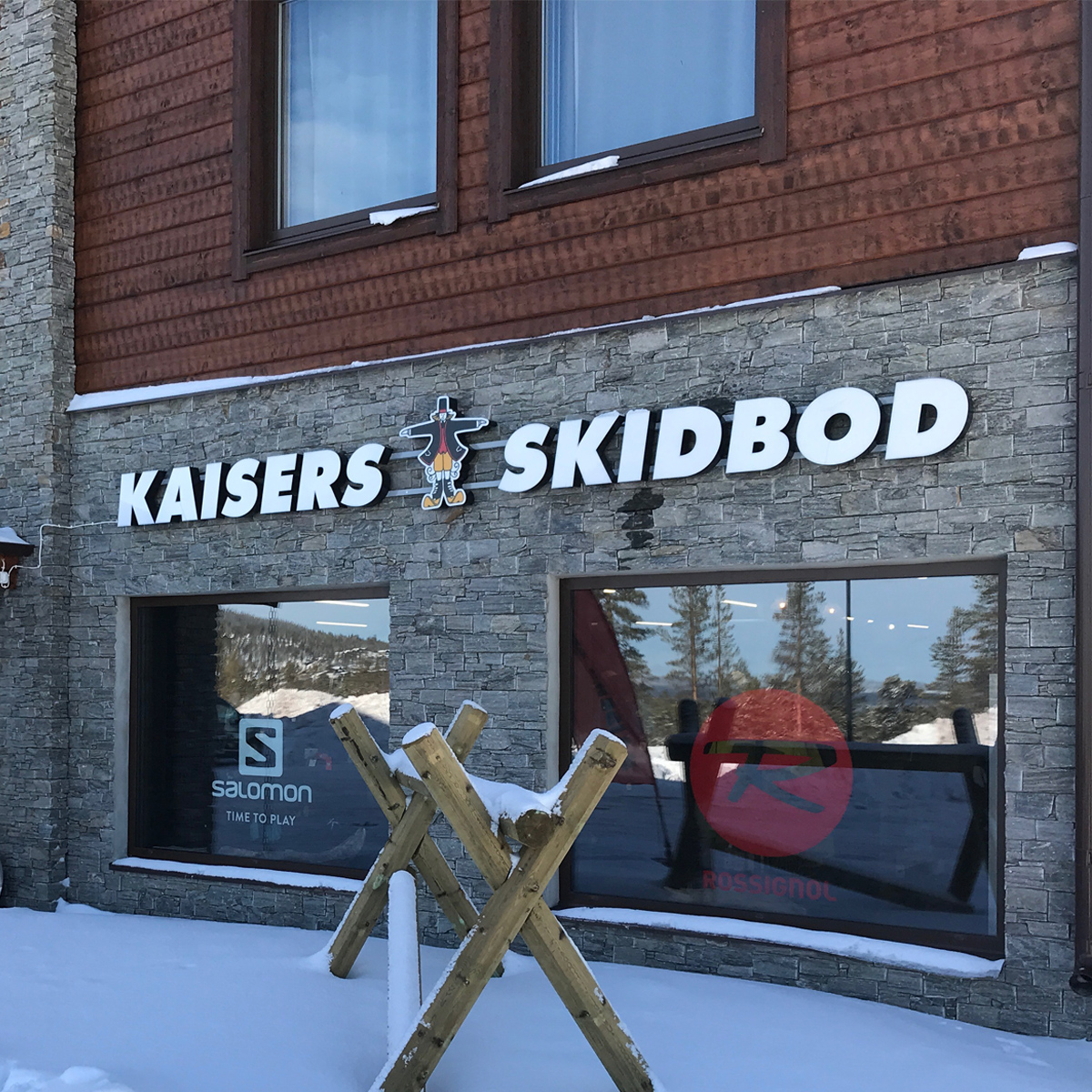 Väl inne på området är det viktigt att gästerna snabbt hittar till de mest centrala funktionerna. Här levererade vi belysta skyltar för Kaisers Skidbo och skiduthyrningen. Två platser som är hjärtat för många av lodgegästerna; där man hyr utrustning, samlas inför dagens skidåkning och avrundar efter en dag i backen. Skyltarna är utformade med vita LED-bokstäver som lyser klart mot fasaderna. Ljuset gör dem lätta att läsa även under mörka vinterkvällar, när kontrasten mellan snö och natt kan vara stor. Det bidrar både till en tryggare miljö och en smidigare gästupplevelse.